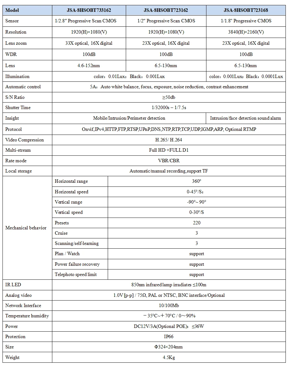 ● 2 ~ 8 миллионов пикселей 1/2.8 Прогрессивное сканирование низкого освещения; ● Наружный шар достигает уровня защиты IP66; Дополнительная поддержка POE опционально; ● Использование 6 инфракрасных ламп, эффективное расстояние облучения может достигать ≤ 150 метров; ● Корпус из алюминиевого сплава, поддержка H.265/H.264/MGPEG двойного кодирования трех потоков; ● Поддержка защиты от молнии, защиты от перенапряжения, функции защиты от перенапряжения; Поддержка памяти отключения питания; ● Поддержка китайского и английского интерфейса IE и Функции оперативной подсказки, удобный интерфейс; ● Скорость горизонтальной установки может быть до 45 °/С, а скорость вертикальной установки может быть до 30 °/с; ● Поддержка 220 предустановленных положений и пропорционального Зума; Скорость горизонтального и вертикального управления 0 ° ~ 45 °/с; ● Поддержка функции часов, предустановленных точек/узоров и круизного сканирования, Горизонтальное сканирование может установить время пребывания. ● Горизонтальное 360 ° непрерывное вращение, вертикальное 0 °-93 °, поддержка автоматического флип без мониторинга слепой области; ● Поддержка Дополнительного протокола ONVIF GB/T28281, плавное соединение с основными брендами NVR или платформами; ● Поддержка пропорциональной функции масштабирования, скорость вращения может регулироваться автоматически в соответствии с увеличением зума объектива.