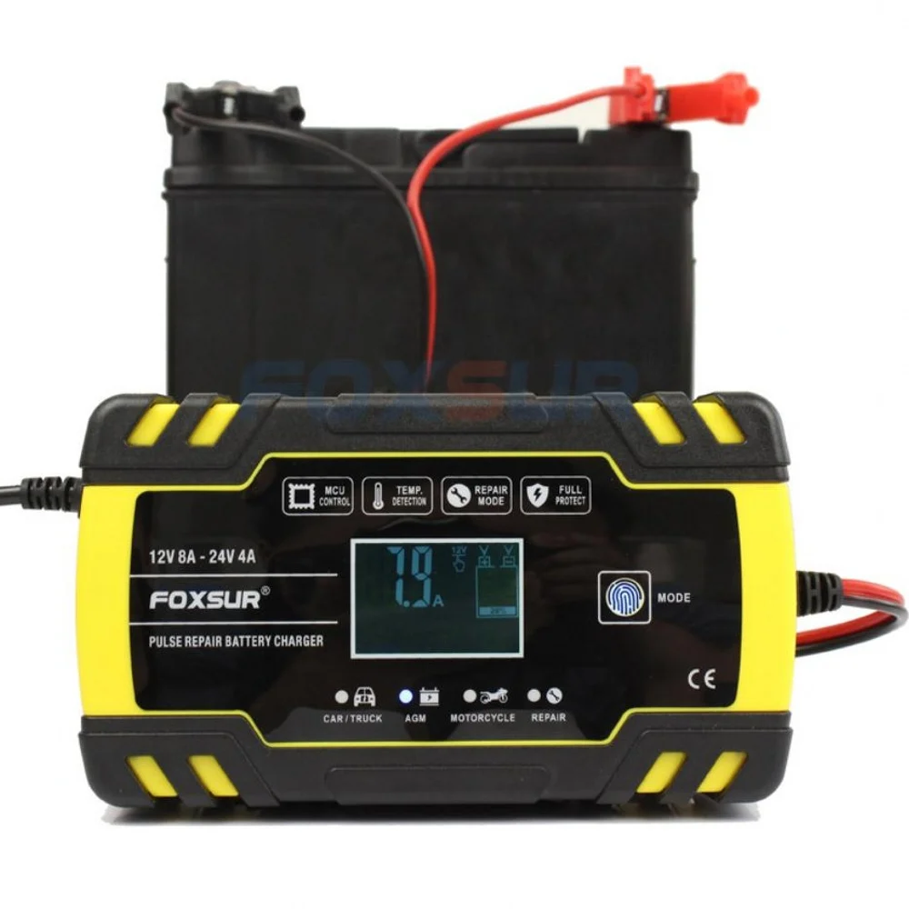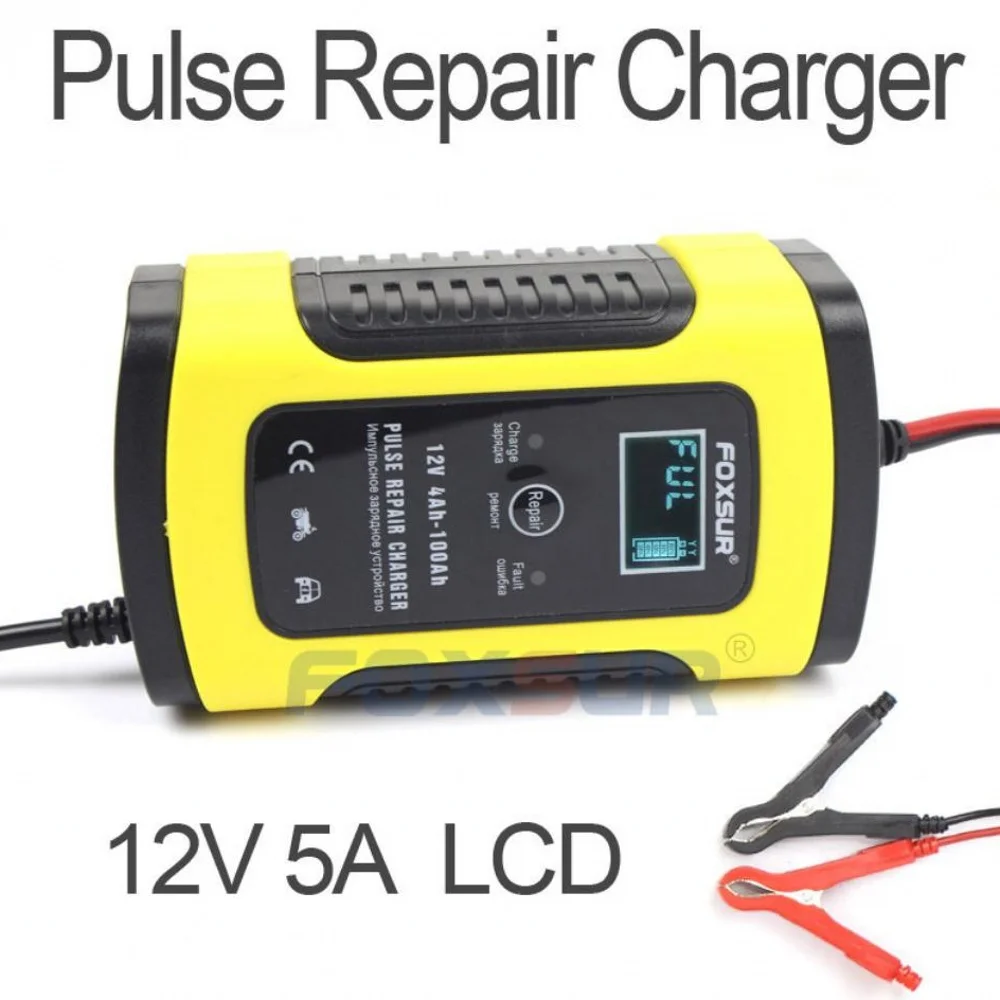 FOXSUR 12V 5A импульсный ремонт Зарядное устройство для мотоциклов и автомобилей Батарея Зарядное устройство с ЖК-дисплей Дисплей 12V AGM гель мокрый свинцово-кислотный Батарея Зарядное устройство