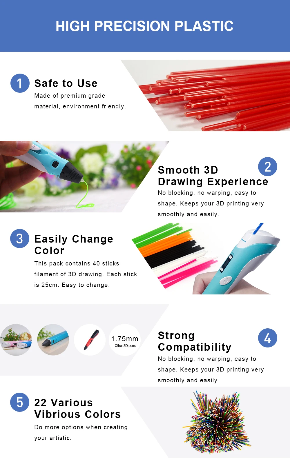 10 метров материал-нить поставляется в 1,75 мм ABS. 40 нитей abs refill обеспечивает большое разнообразие и удовольствие. Используется в 3d-ручках и принтерах-этот пакет используется для всех типов 3d-печати и отлично подходит для детальных и сложных приложений. Он работает с наиболее известными 3d-ручками и принтерами. Высококачественный материал класса А 100% девственница-наша упаковка из АБС-волокна тщательно изготовлена из высококачественного материала, а консистенция круглого диаметра обеспечивает оптимальный поток через экструдер, трубку и насадку. Гибкое использование-этот маленький размер нити 3D ручки позволяет вам менять цвет более легко, когда вы рисуете. Быстро стимулирует ваше воображение. Эта упаковка содержит 40 нитей нити 3D рисунка. Каждая прядь 25 см.