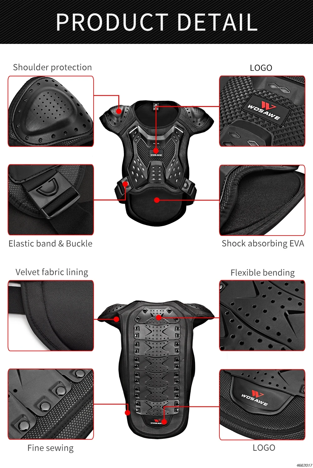 Утолщенные PE оболочки и EVA пены материалы используются для защиты груди, спины, позвоночника и плеч в большей степени