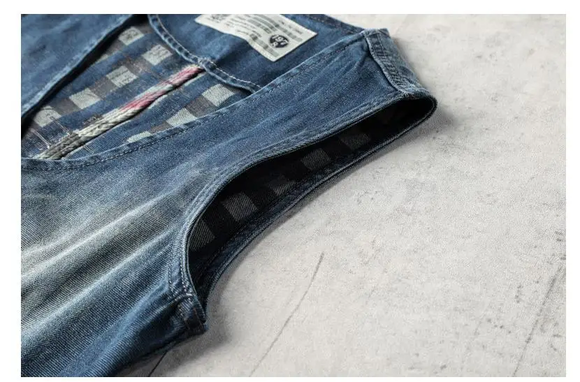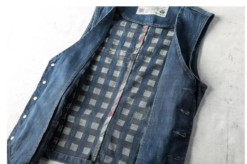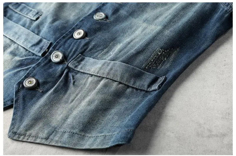 Мужская джинсовая Байкерская жилетка, мужская повседневная синяя облегающая винтажная куртка без рукавов с V-образным вырезом на пуговицах, модный костюм, жилет