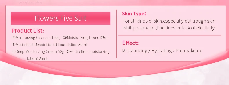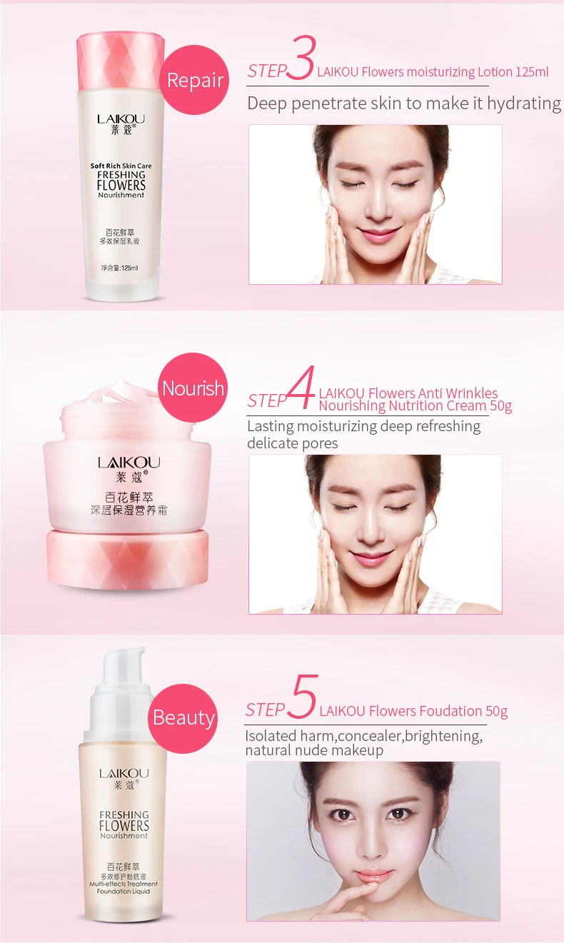 LAIKOU набор для ухода за кожей лица увлажняющий отбеливающий крем для лица тоник эссенция очищающее средство Жидкая Основа макияжа корейский уход за кожей Параметры: Фирменное наименование: LAIKOU Название продукта: набор для ухода за кожей с цветочным принтом Функции: защита от старения, увлажнение, контроль жирности, отбеливание Чистый объем: Уход за лицом крем 50 г Очищающее средство для 108 г Тонер 125 мл Лосьон 125 мл Тональный крем 40 мл Инструкции по использованию: Очиститель: Возьмите необходимое количество на ладони днем и ночью, добавьте воду, чтобы натереть большим количеством пены, аккуратно массируйте петлей, почистите чистой водой. Тонер: после очищения нанесите необходимое количество на подушечки или ладони, погладьте по всему лицу, шею, чтобы впитать. Лосьон: после очищения кожи нанесите необходимое количество на все лицо, шею и погладьте, пока не впитывается Крем для лица: после очистки нанесите равномерно на лицо и массируйте до полного впитывания. Для непрерывной повседневной жизни кожа станет более гладкой, более тонкой и мягкой Крем для макияжа: после основного ухода за кожей нанесите соответствующее количество на лицо, следуя текстуре кожи. Примечание: 1. Хранить в сухом, темном месте; 2. Избегайте контакта с раной; 3. Любые побочные реакции, прекратите использование.